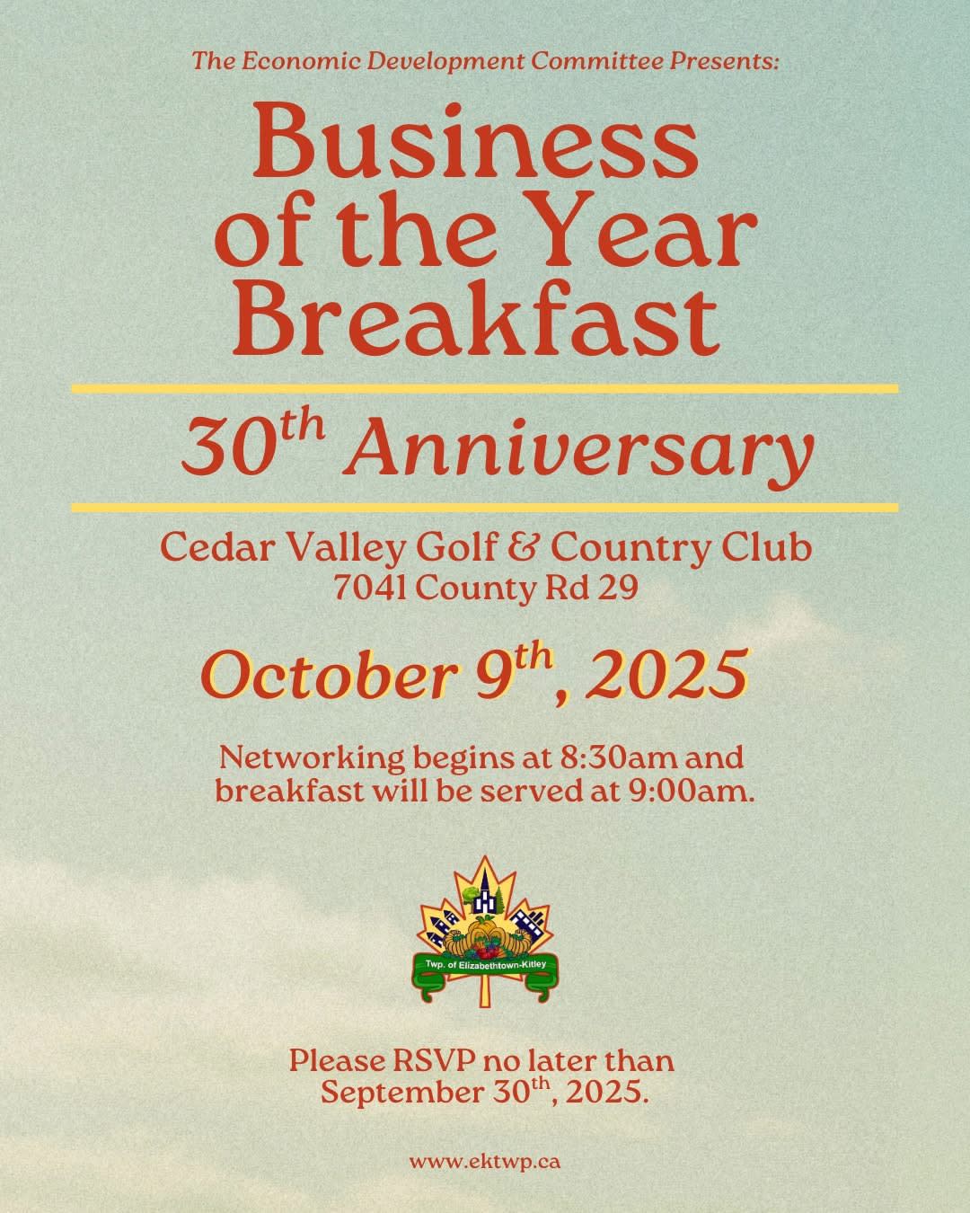 Join the Township of Elizabethtown-Kitley for the 30th Business of the Year Breakfast as they celebrate business excellence in our community!