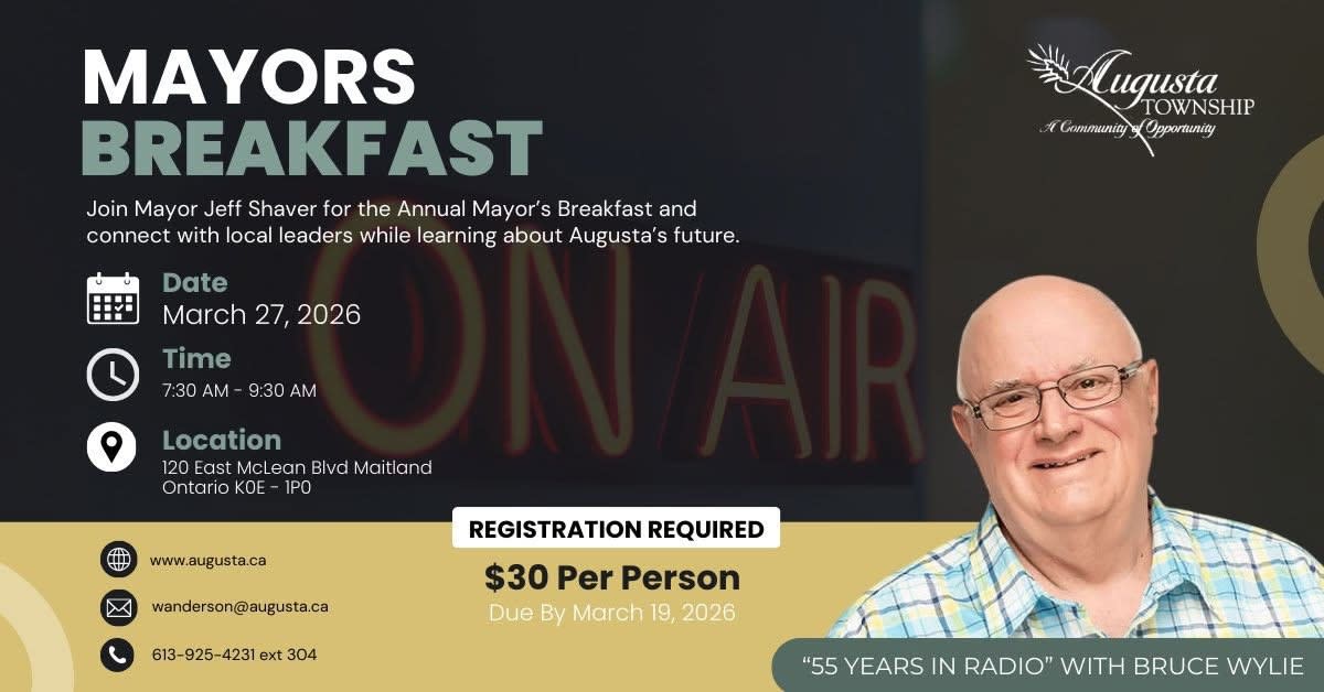 Please note that payment will not be accepted at the door. Payment Options Payment for the Mayor’s Breakfast may be made at the Township Office (3560 County Road 26) by: Debit/Cash or Cheque Payment may also be made by e-transfer to tax@augusta.ca. Please include your name and note that the payment is for the Mayor’s Breakfast.