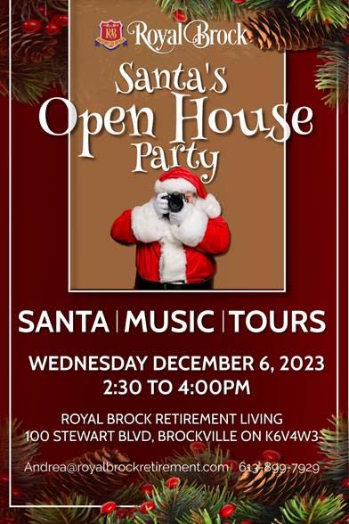 Santa's Open House at Royal Brock Retirement Living on December 6, 2023, from 2:30 to 4:00 pm. It's an afternoon filled with holiday cheer, including building tours, a special visit from Santa, live music, fun games, and delicious treats.